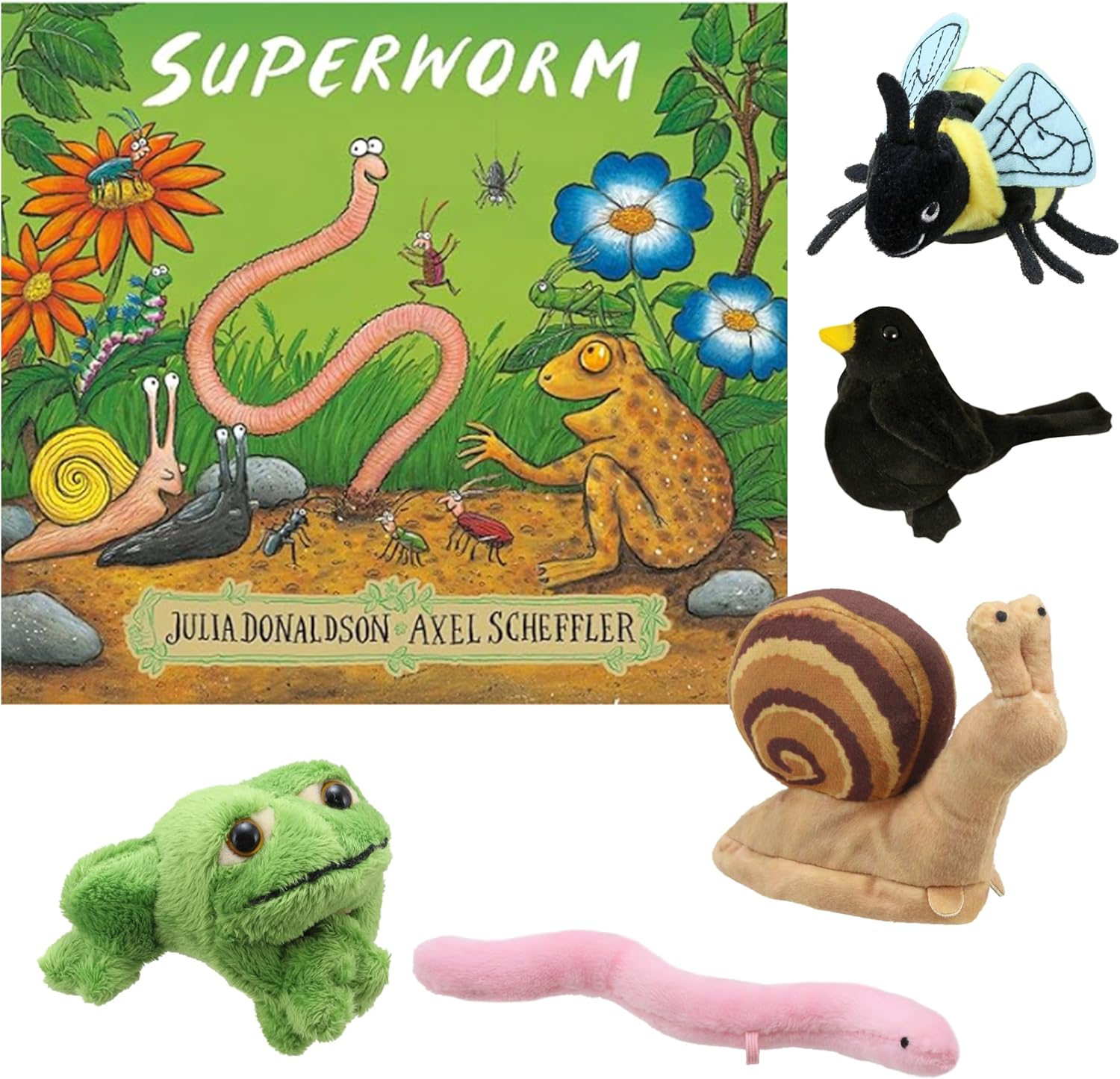 - This fun and interactive set includes the beloved Superworm book and a collection of finger puppets: Swimming Frog, Worm, Bumble Bee, Blackbird, and Green Caterpillar. These playful puppets bring the story's lively characters to life, encouraging children to act out scenes and engage with the adventurous tale of Superworm's bravery and friendship.