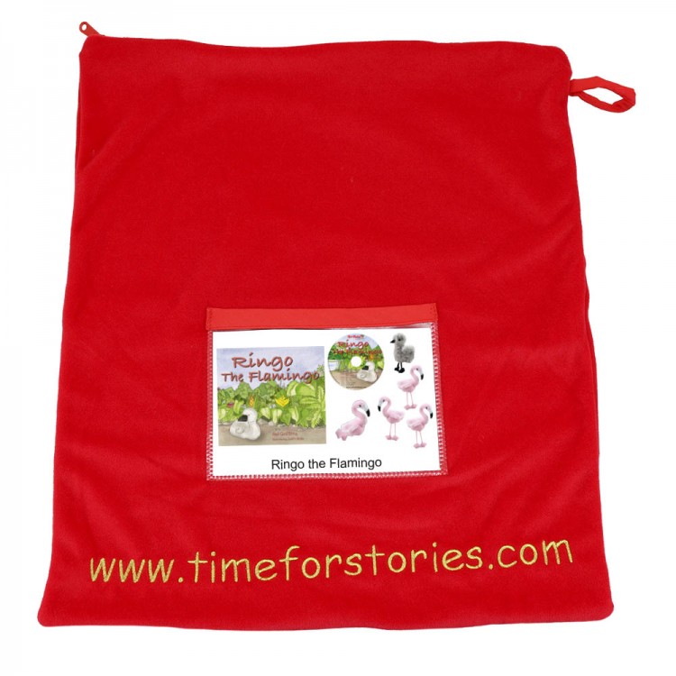 - Storytelling collection includes book, CD, 4 finger puppet flamingos, 1 flamingo chick finger puppet and a zip top red velour storage bag.